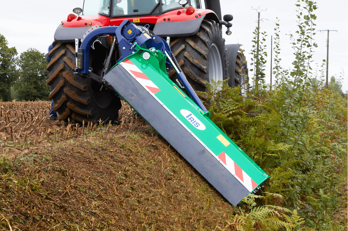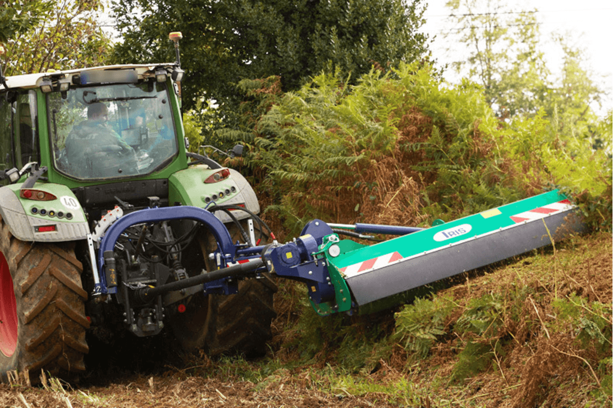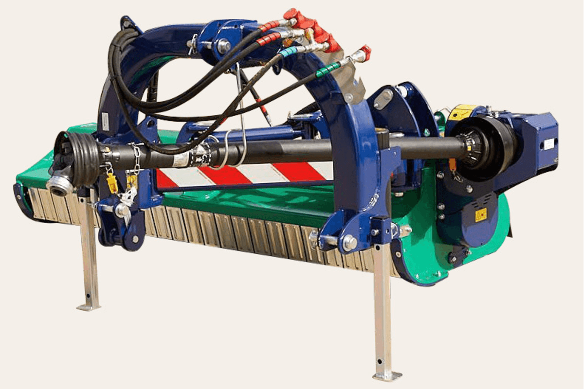 . Attelage 3 points cat. 1, boîtier fonte 540 tours roue libre, patins latéraux réglables, rouleau arrière réglable, orientation hydraulique tête de broyage +90° – 50°, denture Y montée sur boulons, cardan simple homocinétique, sécurité mécanique sur l’attelage,