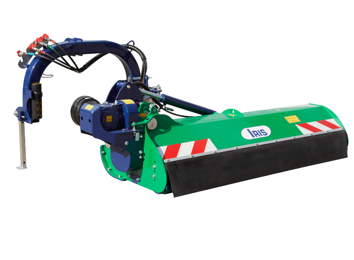 . Attelage 3 points cat. 2, boîtier fonte 540 tours avec roue libre, orientation hydraulique de la tête de broyage +90° -50°,denture marteaux montée sur boulon, déport 55 cm de l’axe du tracteur, rouleau arrière réglable, tendeur automatique de courroies, graissage centralisé, patins latéraux réglables, sécurité mécanique sur l’attelage, accumulateur oléopneumatique (boule d’azote), 4 courroies, cardan simple homocinétique