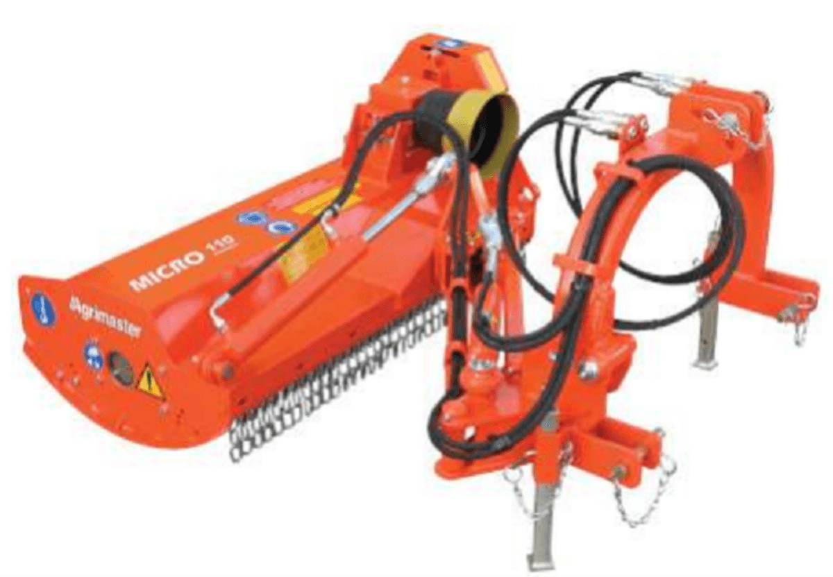 . Attelage 3 points cat. 2, patins latéraux réglables, attelage avant/arrière, déport latéral sur glissière, rouleau arrière réglable, tendeur automatique de courroies, boîtier 1000 tours avec roue libre, orientation hydraulique tête de broyage +90° -70°, denture marteaux montée sur boulon, graissage centralisé, accumulateur oléopneumatique (boule d’azote), sécurité mécanique sur l’attelage