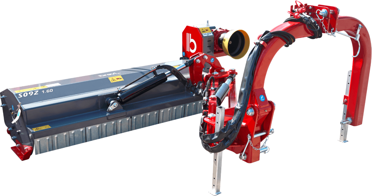 . Attelage 3 points cat. 1, boîtier fonte 540 tours roue libre, patins latéraux réglables, rouleau arrière réglable, orientation hydraulique tête de broyage +90° – 50°, denture Y montée sur boulons, cardan simple homocinétique, sécurité mécanique sur l’attelage,