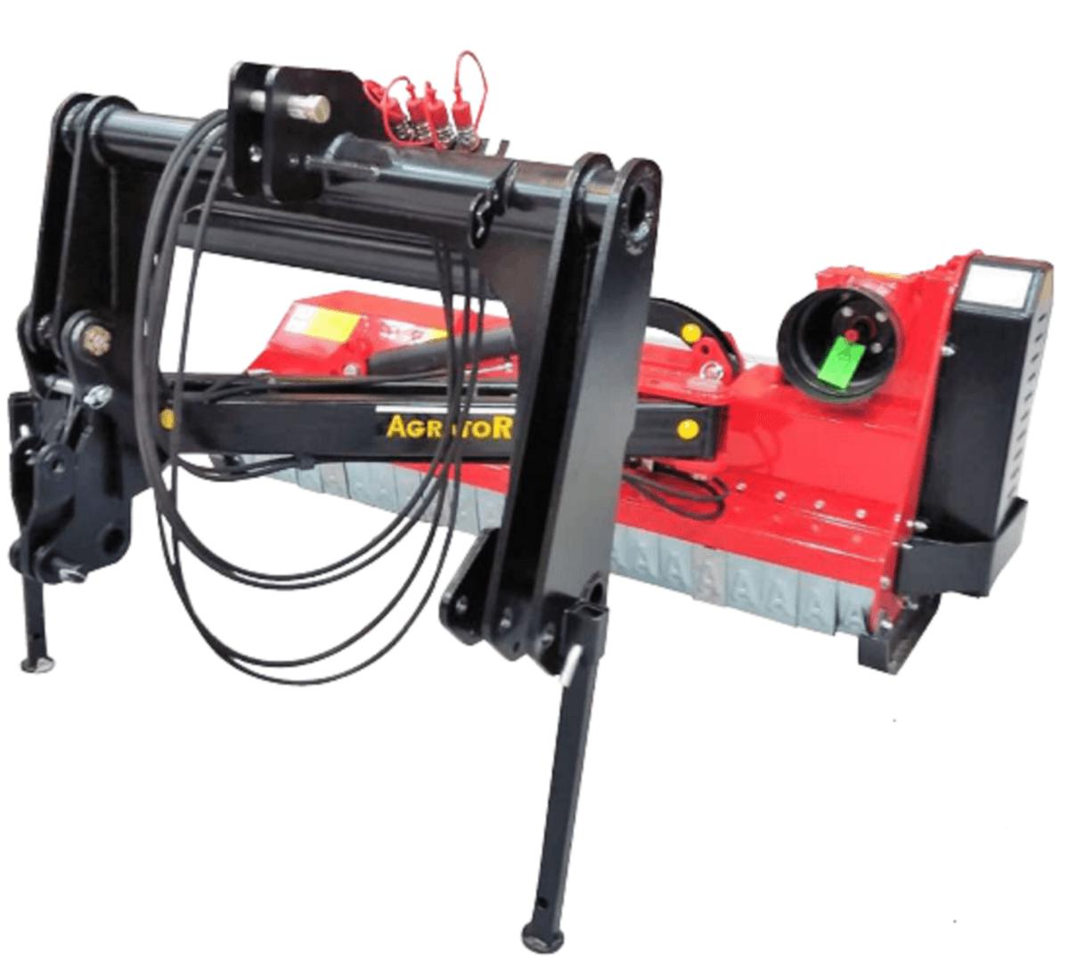 . Attelage 3 points cat. 1, boîtier fonte 540 tours roue libre, denture marteaux montée sur boulon ,orientation hydraulique de la tête de broyage +90° -50°, déport 70 cm de l’axe du tracteur, rouleau arrière réglable, sécurité mécanique sur l’attelage, tendeur automatique de courroies, graissage centralisé, patins réglables, 3 courroies, cardan simple homocinétique
