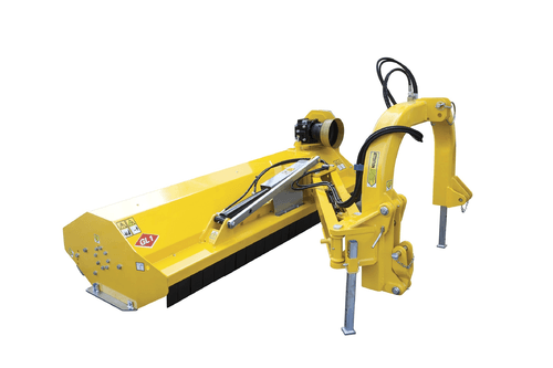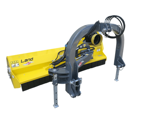 . Attelage 3 points cat. 1, boîtier fonte 540 tours roue libre, patins latéraux réglables, rouleau arrière réglable, orientation hydraulique tête de broyage +90° – 50°, denture Y montée sur boulons, cardan simple homocinétique, sécurité mécanique sur l’attelage,