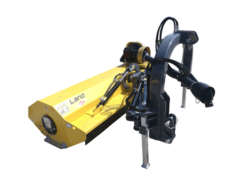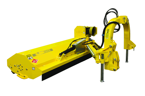 . Attelage 3 points cat. 2, boîtier fonte 540 tours avec roue libre, orientation hydraulique de la tête de broyage +90° -50°,denture marteaux montée sur boulon, déport 55 cm de l’axe du tracteur, rouleau arrière réglable, tendeur automatique de courroies, graissage centralisé, patins latéraux réglables, sécurité mécanique sur l’attelage, accumulateur oléopneumatique (boule d’azote), 4 courroies, cardan simple homocinétique