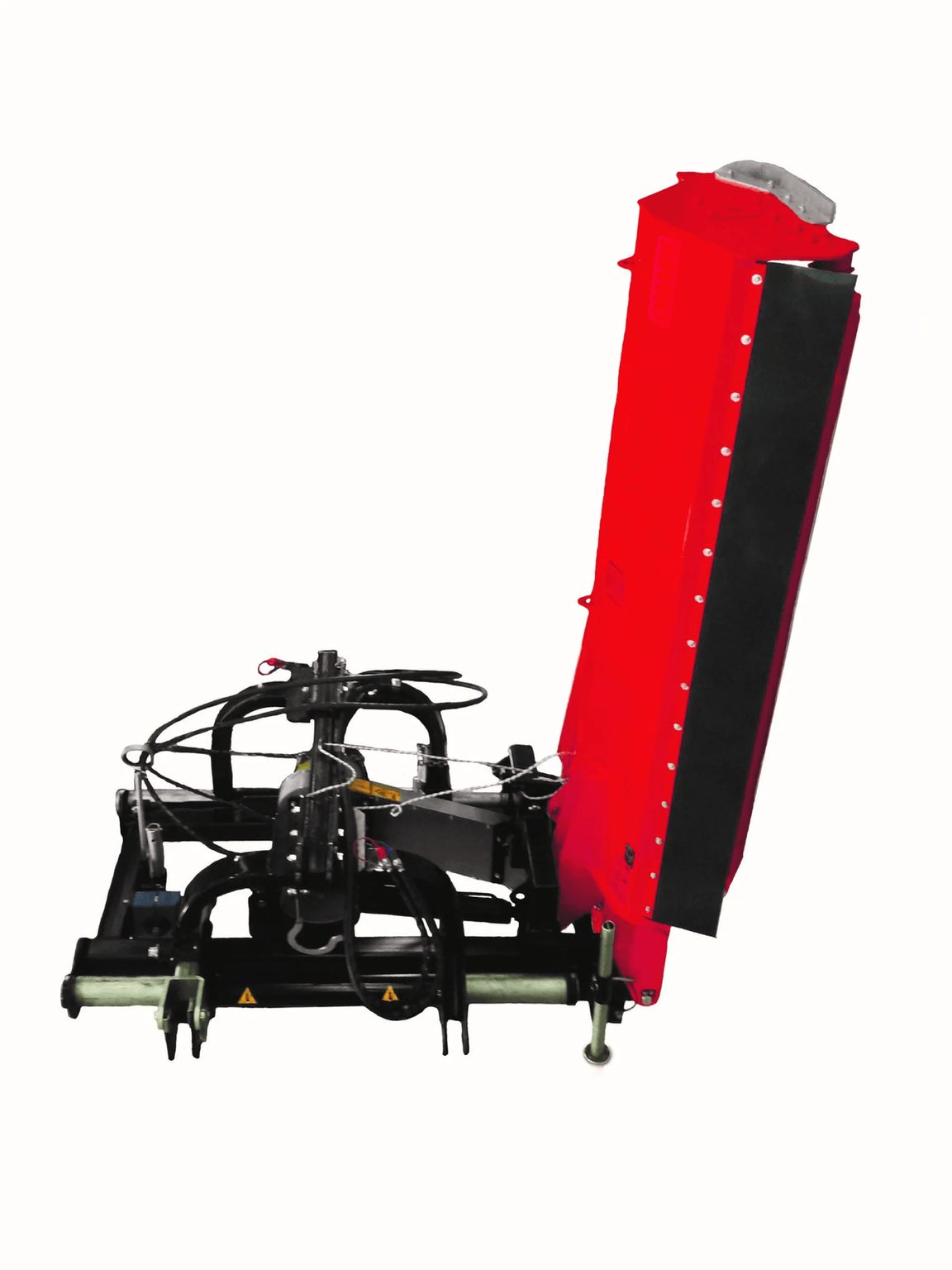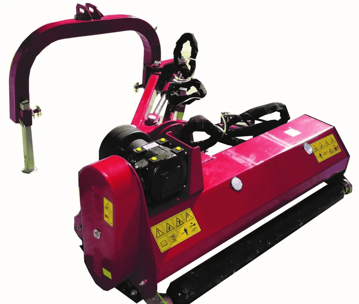 . Attelage 3 points cat. 1, boîtier fonte 540 tours roue libre, patins latéraux réglables, rouleau arrière réglable, orientation hydraulique tête de broyage +90° – 50°, denture Y montée sur boulons, cardan simple homocinétique, sécurité mécanique sur l’attelage,