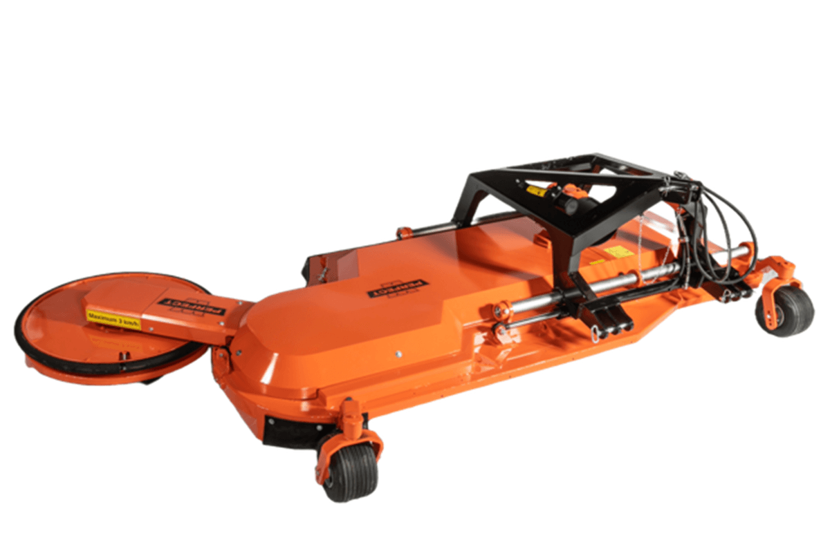 Broyage à droite : attelage 3 points arrière, 3 points avant ou chargeur. Broyage à gauche : attelage 3 points avant et télescopique. Rotor avec 3 couteaux escamotables. Couteaux 3 positions. Vitesse de rotation du rotor 1 900 tr/mn à 50 L/mn. Coupelle d'appui Ø 700 mm libre en rotation avec semelle HARDOX et inclinaison pour un meilleur suivi du sol. Effacement par vérin et boule d'azote réglable par pompe à main. Largeur de travail : 1 m. Fabriqué en France