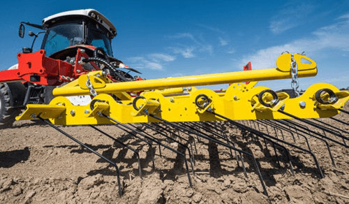 Dents individuelles de 7 mm, jusqu’à 530 mm de passage (pour culture haute et buttes), réglage hydraulique de l’agressivité (jusqu’à 6 kg de pression par dent), châssis fermé qui s’adapte parfaitement au sol, repliage facile, silencieux même à vitesse élevée. Largeurs de travail de 2 m à 15 m. Choix d’équipements en option.