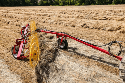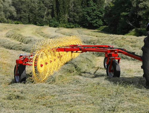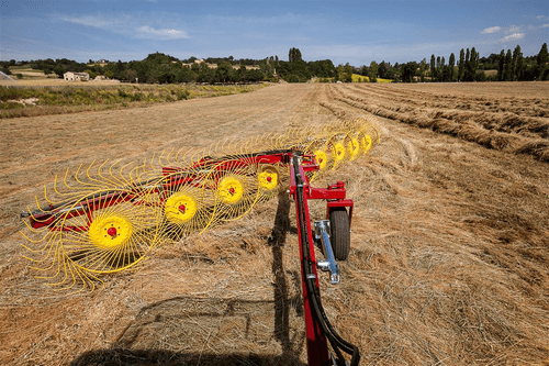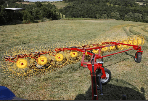 Andaineur soleils MKE Evolution AUTO-DIRECTIONNEL équipé de 12 roues soleil de 1,40 m de diamètre et avec 40 dents chacune. Avec une largeur de travail de 7,6 m et une largeur de transport de 2,55 m. La puissance minimum requise du tracteur est de 30cv. Largeur d’andain minimum 0,90 m et maximum de 1,8 m. Choix d’options.