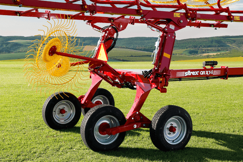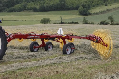 Andaineur soleils MKE Evolution AUTO-DIRECTIONNEL équipé de 12 roues soleil de 1,40 m de diamètre et avec 40 dents chacune. Avec une largeur de travail de 7,6 m et une largeur de transport de 2,55 m. La puissance minimum requise du tracteur est de 30cv. Largeur d’andain minimum 0,90 m et maximum de 1,8 m. Choix d’options.