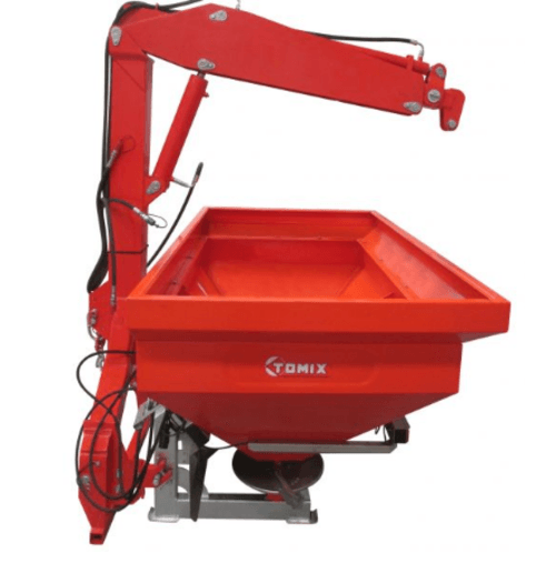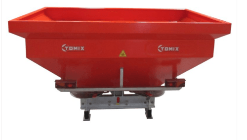1 - Distributeur d'engrais centrifuge à disques DCQ, cuve de tôle d'acier, châssis en structure tubulaire en acier galvanisé, 2 disques de distribution en acier inoxydable avec 2 lames chacun, régulateur de débit hydraulique, multiplicateur de 1 vitesse, grille de protection intérieure, livré avec cardan A02 x 1000.