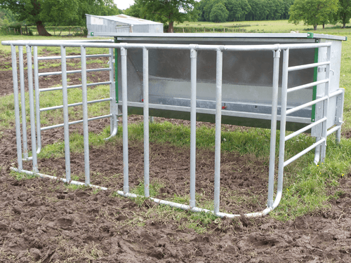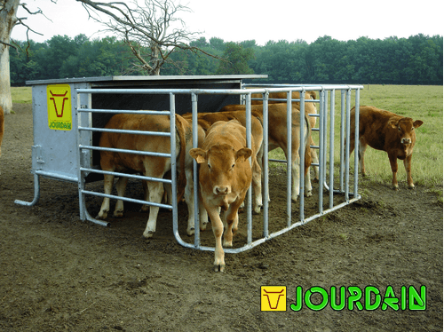 Description Nourrisseur 2,2 m ou 3 m avec auge anti gaspillage de grande dimension. Livré avec enclos relevable pour l'alimentation des bovins encornés.