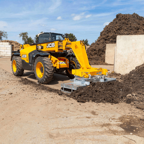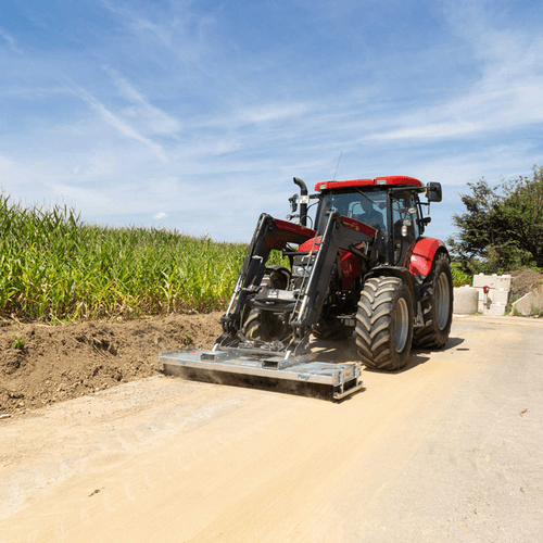 II -La balayeuse PRONET montage frontal tracteur, chargeur et télescopique, attelage avec liaison par parallélogramme flottant, montage frontal avec roues positionnées entre l’attelage et le balai pour un meilleur suivi du terrain.
