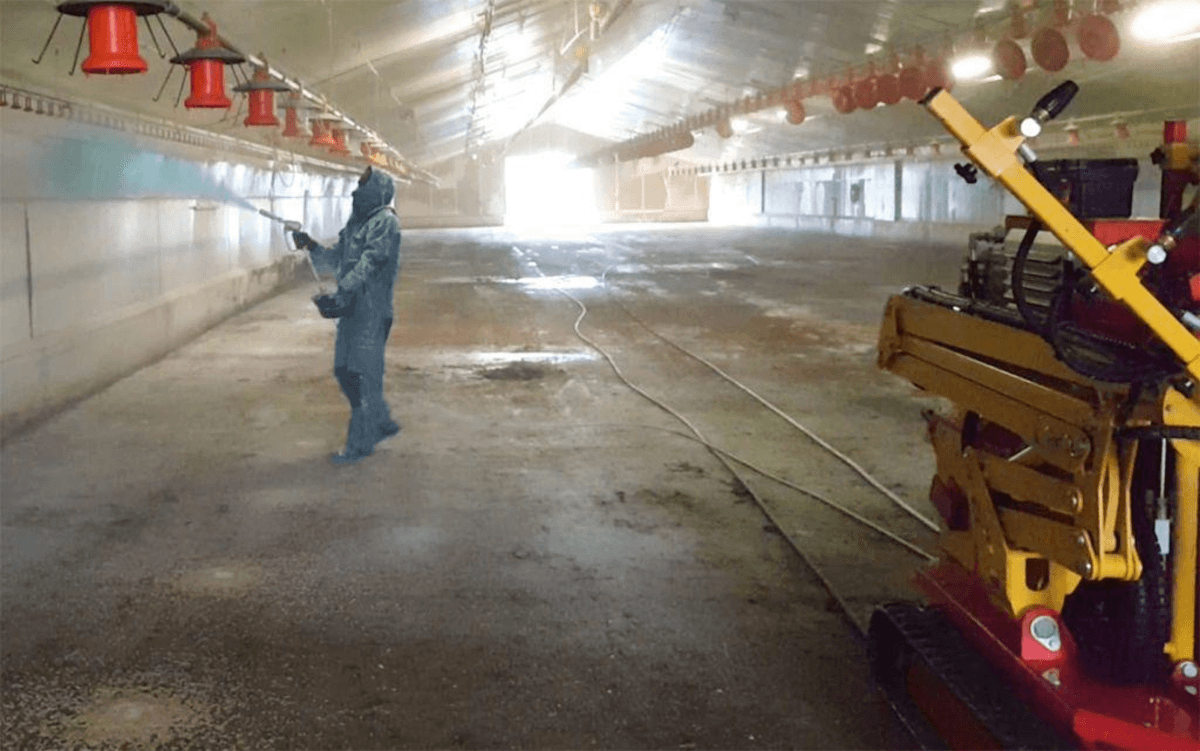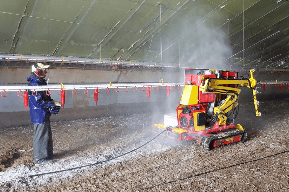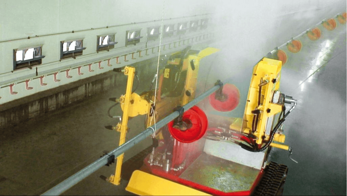 Avec un groupe haute pression posé à l’extérieur du bâtiment avec cuve tampon de 1000 litres en même temps qu’une vanne de vidange avec enrouleur de tuyau HP, longueur 100 mètres, une pompe haute pression de 140 bars et de 87 l/min de débit. Moteur thermique essence 22 ch. Rampe 1,58 m avec 6 rotabuses.