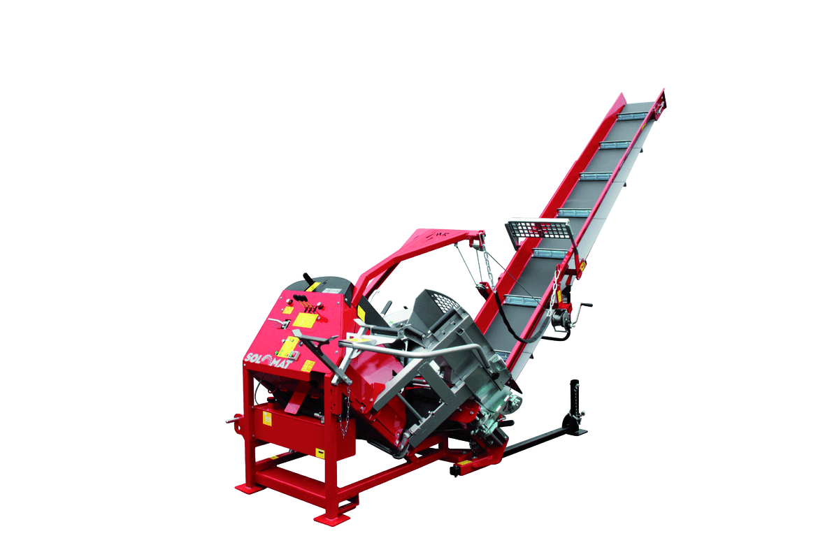 Scie circulaire avec tambour 3 alvéoles permettant un débit de chantier élevé. Réglage de la longueur de coupe de 25 à 52 cm, Ø de bois maxi 19 cm, longueur de bois à scier jusqu’à 1 m. Tapis fixe de 5 m de long (orientable en option). Lame en carbure Ø 700 mm. Entraînement pdf (existe en combiné pdf-électrique).