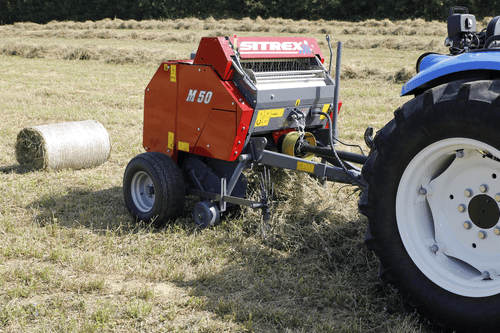 Presse à chambre fixe chaînes barrettes. Ø 1,20 m. Ameneur alternatif. Pick up largeur 2 m. Lubrification automatique des chaînes. Serrage hydraulique de la balle. Boîtier de contrôle électrique. Liage filet. Roues 400/60-15,5. Cardan homocinétique.