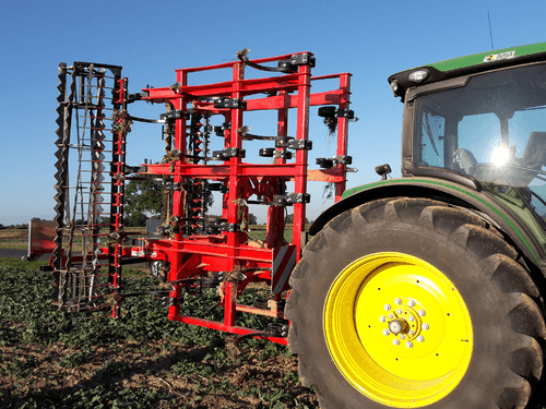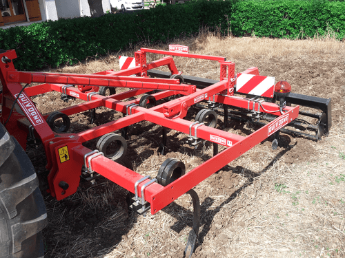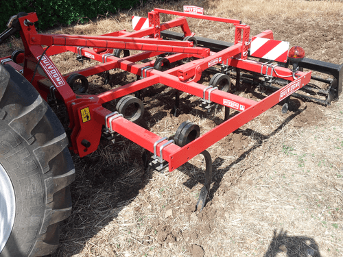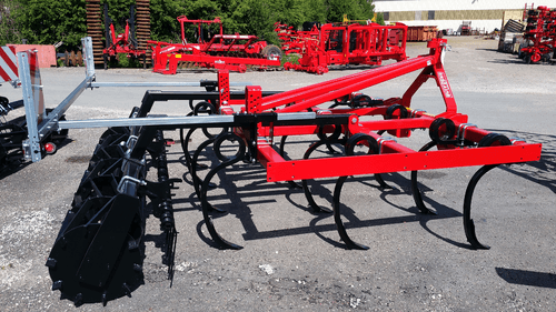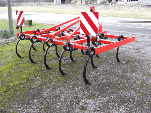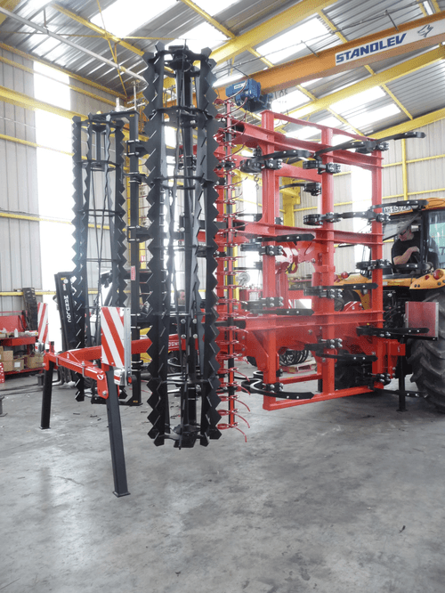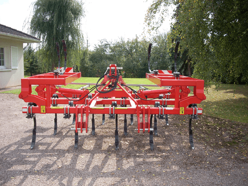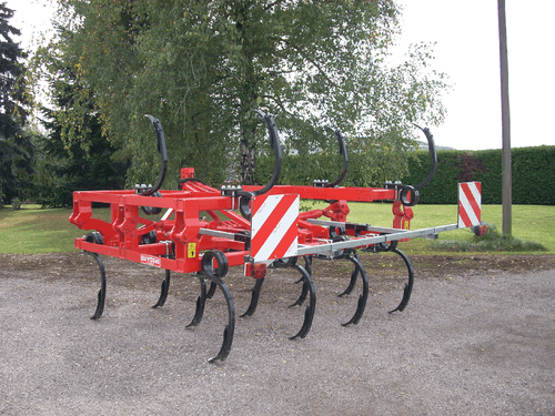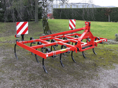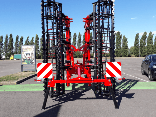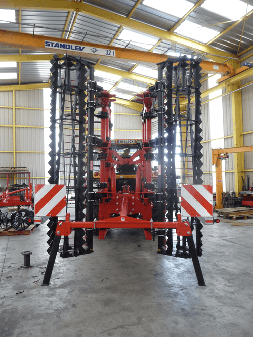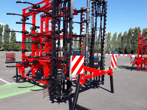 2 - Herse HVSL est un modèle lourd équipé de dents mangano-siliceux de 28 mm, longueur 280 mm qui conviennent aux sols les plus durs. Châssis bipoutre 100 x 100 jusqu’à 6,3 m et tripoutre à partir de 7,3 m.