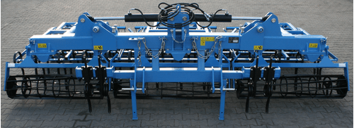 Attelage 3 points cat. II et III sur axes. 4 rangées de dents de cultivateur SU 32x12 renforcées avec soc standard. Double rouleau en fers plats dentés Ø 300mm.