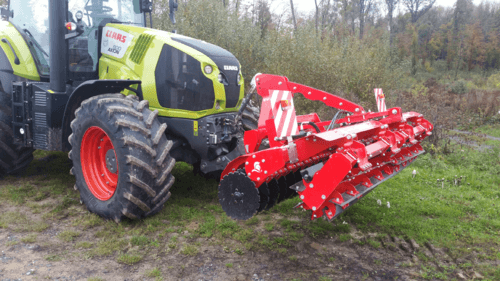Equipé d’un attelage 3 points en chape poussé directionnel catégorie 2, anneaux fonte de 700 mm de diamètre à branches incurvées, angle 45°, décrottoirs à chaines.