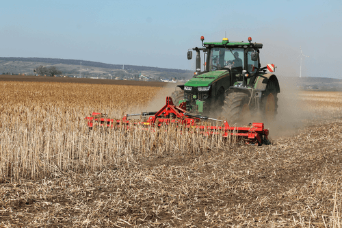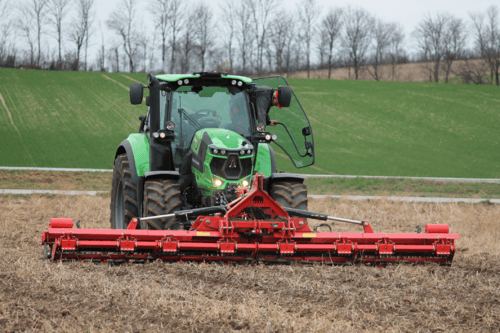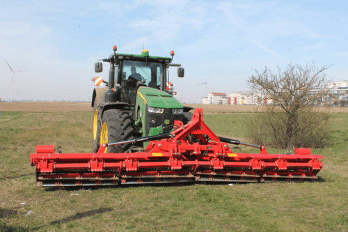4 - RLP, rouleau porté poussé adapté aux conditions difficiles avec 2 rangées de dents vibrantes 32 x 10 mm, écartées de 16 cm et un dégagement sous châssis de 400 mm.