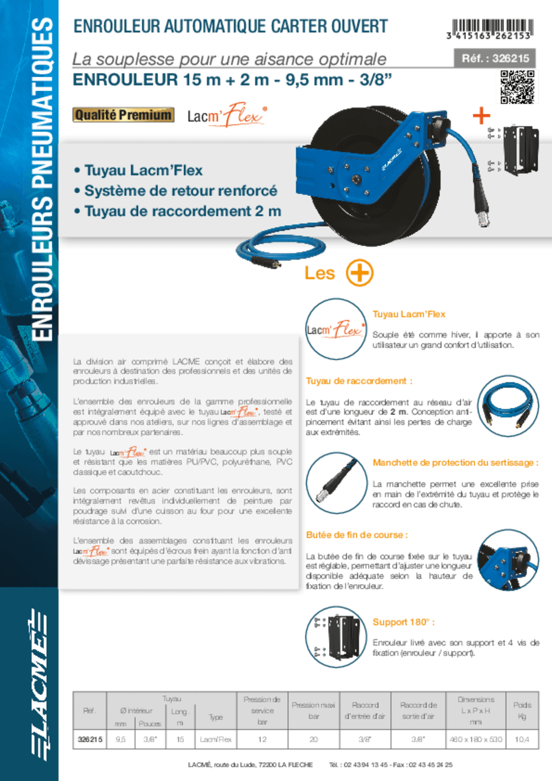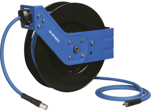 Enrouleur à tuyau d'air. Rappel automatique. Tuyau caoutchouc, carter ouvert, chassis en acier. Longueur : 15 m. Diamètre : 9/15 mm. Raccord rapide : entrée d'air : 3/8'', sortie d'air : 3/8''. Pression maxi : 20 Bar, pression utilisation : 12 Bar. Diamètre du tambour : 425 mm. Support mural en L, orientable 180°. Butée de tuyau réglable. Bras réglable selon le support de fixation (mur, sol, plafond). Câble d'alimentation de 2 m.