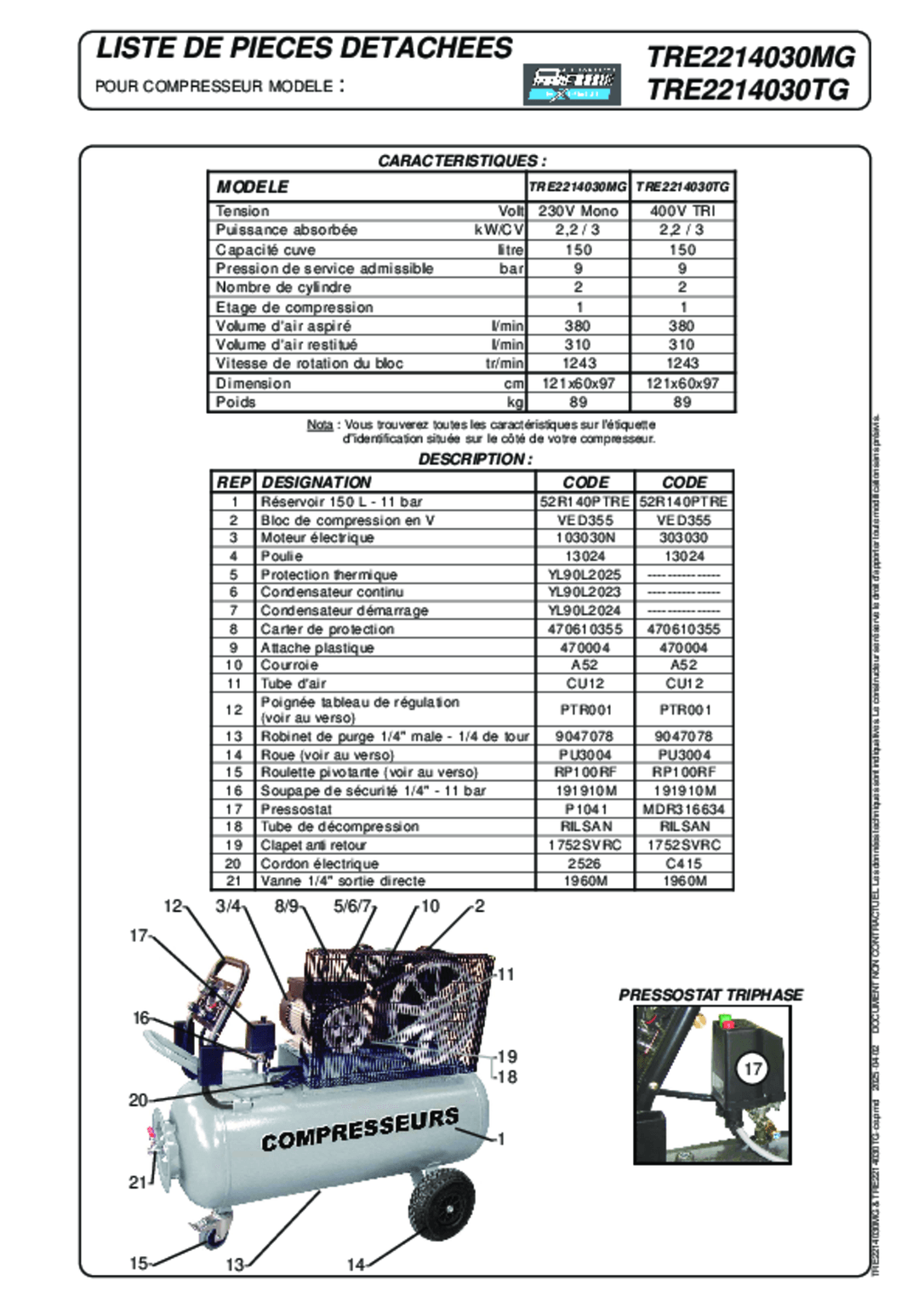 Triphasé. Moteur bicylindre en V, 3 CV, air restitué 310 L/min. Grosses roues pleines. Tuyau 20 m avec poignée.