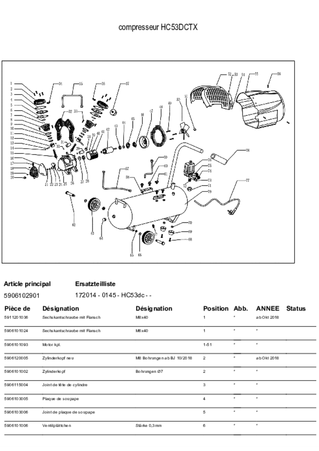 Sans huile. 6 L. Débit restitué : 61 L/min, 8 Bar. Moteur bicylindre S1, 0,75 CV. 220 V.