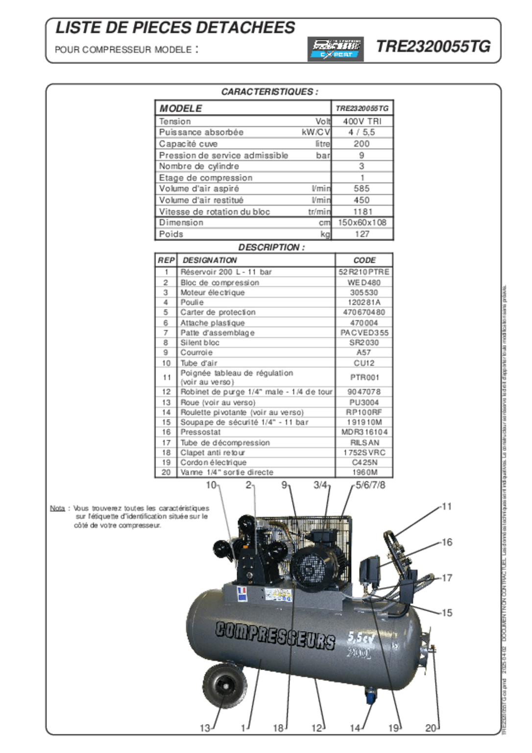Débit aspiré : 380 L/min, débit restitué : 310 L/min, 9 Bar.
