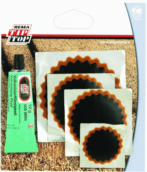 Rustines bordées d'une double dentelure permettant une liaison parfaite avec la chambre à air et une vulcanisation à 100%. Contient : 4 rustines n°1 (ronde, Ø 33 mm), 2 rustines n°2 (ronde, Ø 45 mm), 1 rustine n°3 (ronde, Ø 54 mm), 1 rustine n°4 (ronde, Ø 75 mm), 1 rustine n°7 (ovale, 74x37 mm), 1 rustine F3, 1 tube de 10 g de liquide vulcanisant, 1 râpe métal.