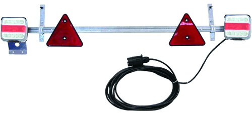 Tube en acier galvanisé rectangulaire 30x10 mm. Câble 7,5m, longueur 1,60m. 2 feux avec ampoules, 2 triangles réfléchissants, 2 pattes de fixation réglables, 1 support de plaque, 1 plaque d'immatriculation vierge, 1 fiche de 7 broches plastiques.