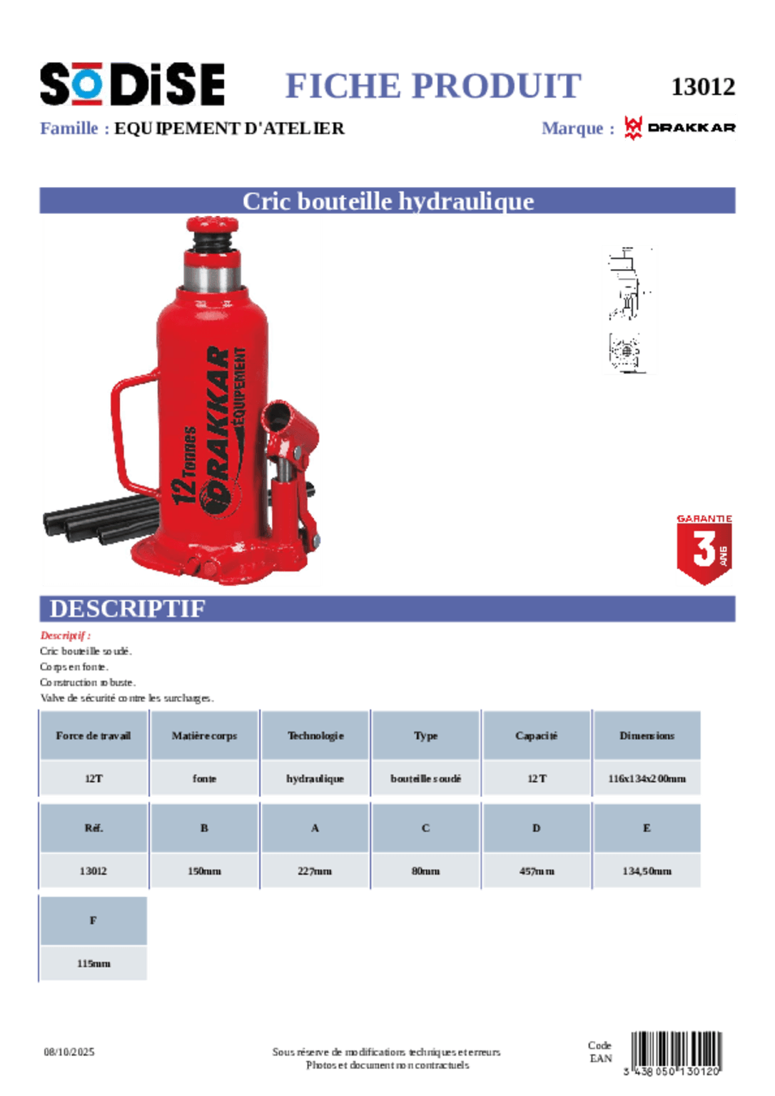 Cric hydraulique 3 tonnes