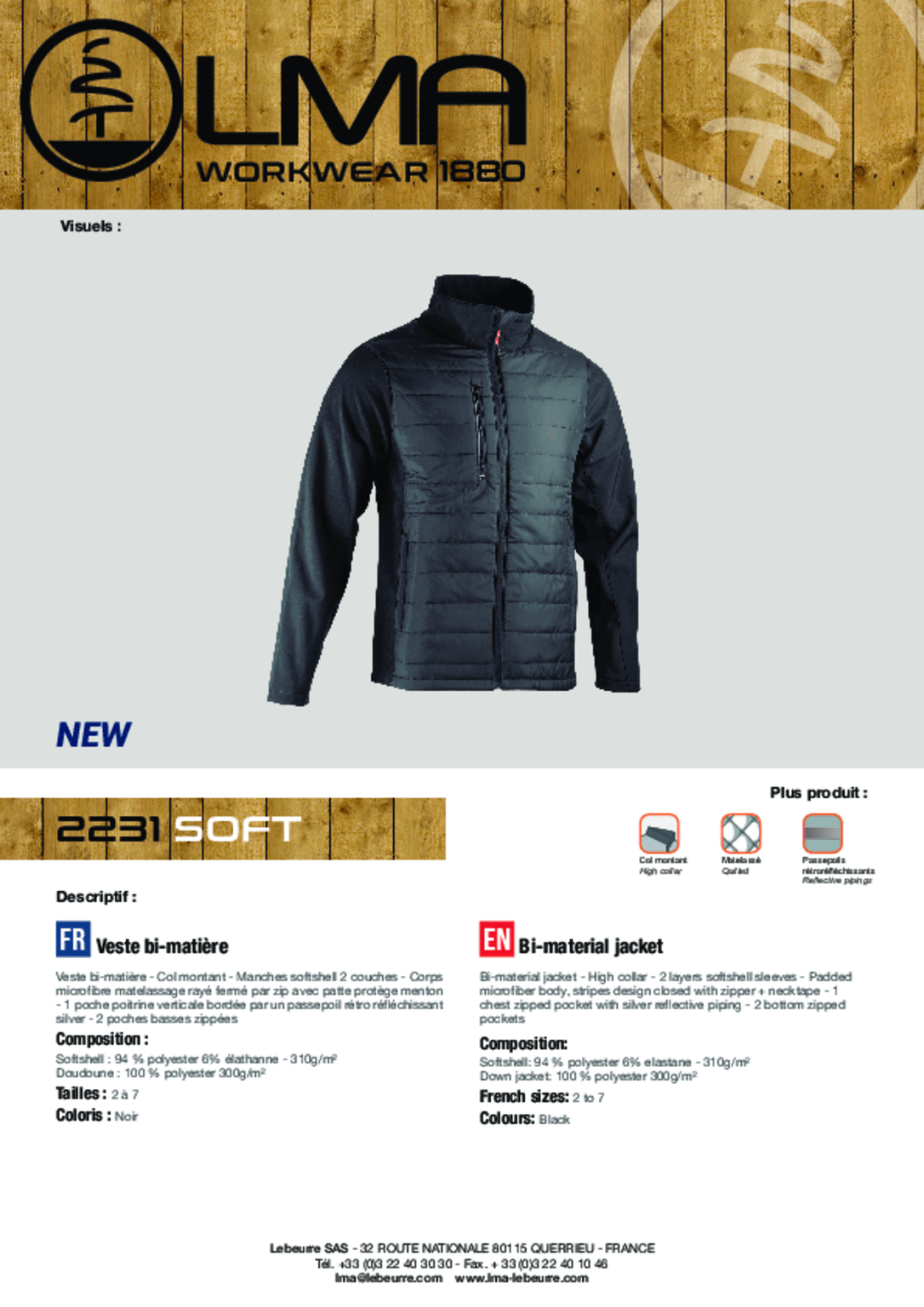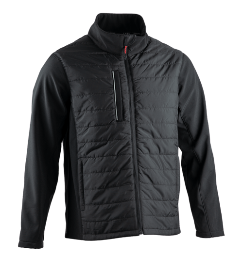 Col montant, manches softshell 2 couches, corps microfibre matelassage rayé, fermé par zip avec patte protège menton, 1 poche poitrine verticale, 2 poches basses zippées.
