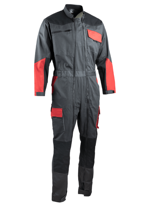 Col officier, 2 poches poitrine zippées dont une à ouverture verticale, bas de manches et bas de jambes resserrables par patte avec bande auto agrippante, ceinture 4 passants élastiquée côtés et dos, 2 soufflets d'aisance dos, 2 poches main + ouvertures passe-mains, 1 poche plaquée dos avec rabat, 1 grande poche plaquée cuisse gauche fermée par rabat, 1 poche téléphone plaquée fermée par rabat, 1 poche mètre bicolore, empiècements contrastants de renfort genoux, systèmes easy feet et flexi top.