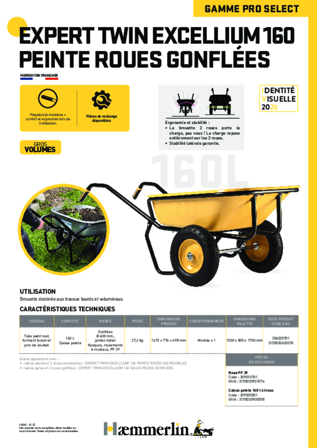2 roues gonflées, diamètre 400 mm, montée sur roulements à rouleaux.