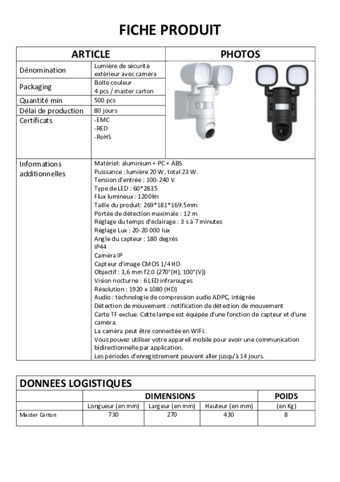 Objectif : 3.6mm f2.0 ( 270°(H), 100°(V) ).