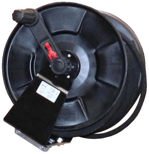 Enrouleur pour Gladiator pour fixation sur armature de protection. Plaque de fixation en acier. Tambour ABS. Manivelle avec verrouillage manuel. Flexible de raccordement bleu 3/8, 140 cm. Capacité flexible maximale : 20 m flexible 5/16 bleu (flexible vendu séparément).