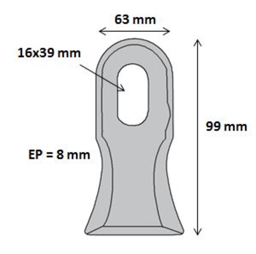 Longueur : 99 mm. Largeur : 45 mm. Epaisseur : 8 mm. Diamètre : 16x39 mm. Référence Kuhn : A5407230/A5407231/A5402960. Référence Nicolas : 360.15.173. Référence Noremat : 1.39.235.NR ou 103059. Référence SMA :FM48.