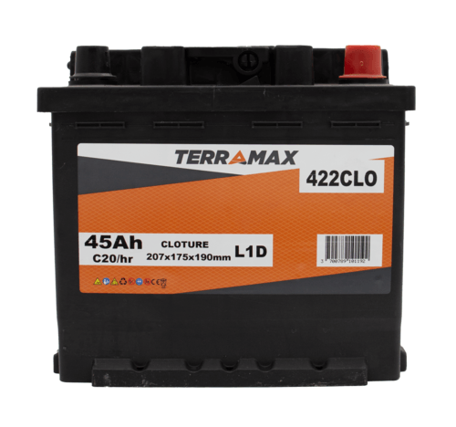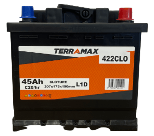 Batterie de clôture. Décharge lente. Tension : 12 V. Capacité : 45 Ah. Dimensions : 207x175x190 mm. Bornes : longueur. Polarité + : à droite.