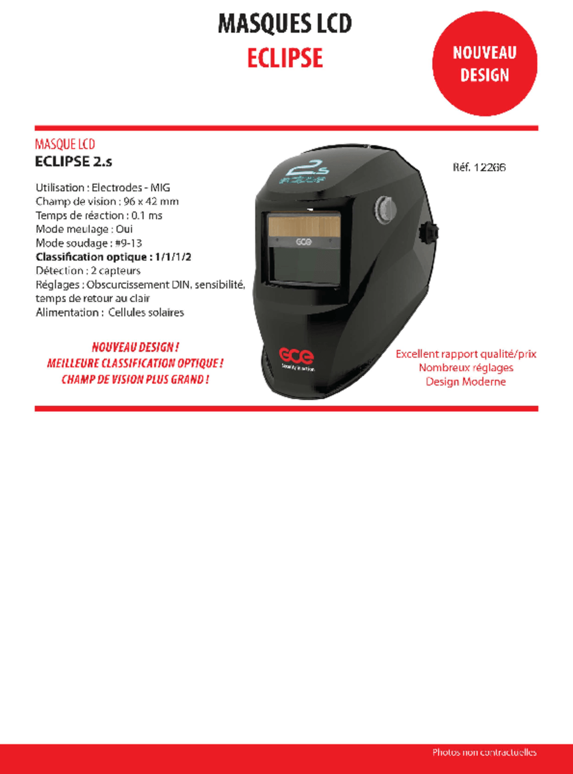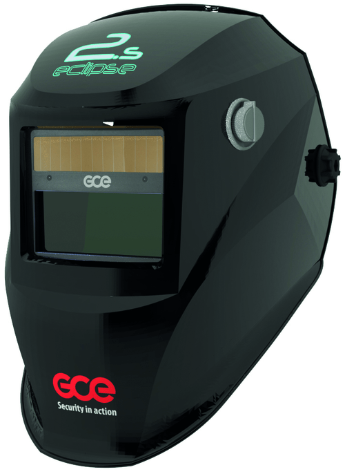 Masque à souder Eclipse 2.s. DIN 9-13 électronique très fiable pour le soudage MIG et à l'électrode. Alimentation : cellules solaires. Fonctionne sans batterie. Teinté 9 à 13. Champs de vision : 96×42 mm. Détection : 2 capteurs. Temps de réaction : 0,1 msec. Nuance foncée : DIN 9-13 ajustement externe. Temps de retour au clair : de 0,1 à 0,9 sec, ajustement interne continu. Appui-tête : réglable en de nombreuses positions. Norme : EN-379 (filtre) et EN-175 (masque). Classification optique : 1/1/1/2.